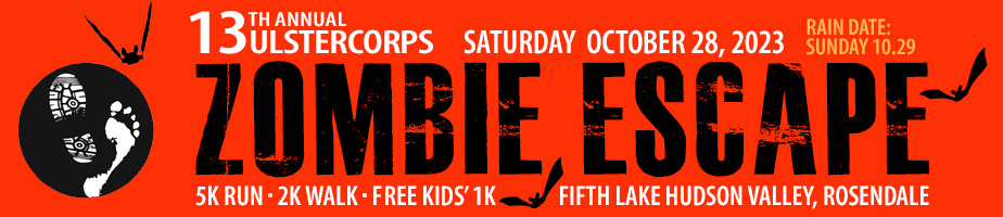 Kick off your Halloween at UlsterCorps’ 13th Annual Zombie Escape, Saturday October 28th, 2023 (Sunday October 29th rain date), at Fifth Lake Hudson Valley (formerly Williams Lake) in Rosendale. Events include a 5k timed trail run, 2k walk and a free 1k Fun Run for kids. The Zombie Escape is UlsterCorps’ primary annual fundraiser, and a perfect family friendly way to start your Halloween while supporting a great cause. Enjoy the spectacular fall foliage and beautiful trails at Williams Lake, while passing zombies and other spooky surprises hiding in the woods, tunnels and caves. All runners including kids will receive a themed race medal. Custom awards in overall and age groups for the 5K. Register for the 5K Race or 2K Walk by Friday October 6th and receive a FREE t-shirt!