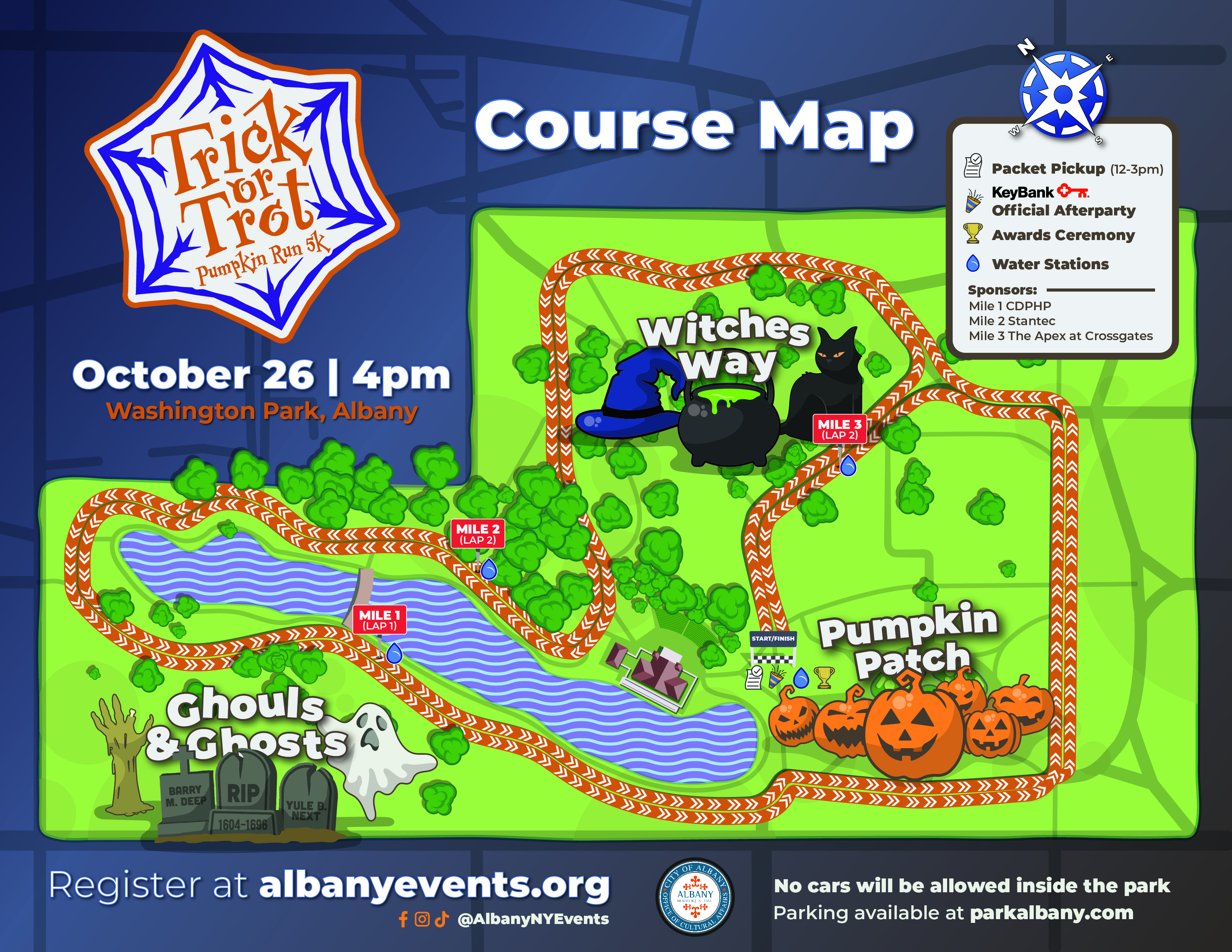The City of Albany’s Trick or Trot Pumpkin Run is a great race for all ages, featuring a beautiful Halloween decorated course through Washington Park! Following the race, there will be an afterparty event featuring giveaways, vendors, decorations, DJ, Best Costume prizes and awards recognition posting of the results, featuring age-based divisional awards and random prize drawings. This race also features chip timing by ARE Event Productions. All registered runners will receive a wicking fabric shirt.  Warmups and lining up by 4:00pm, race starts at 4:30pm.
